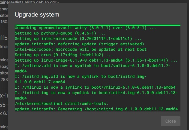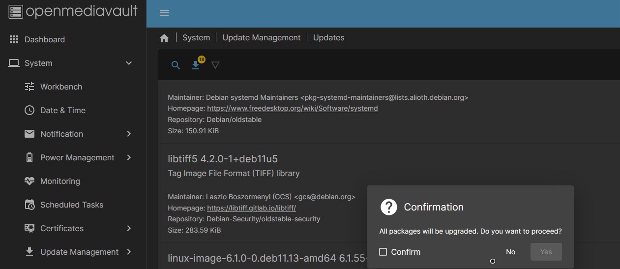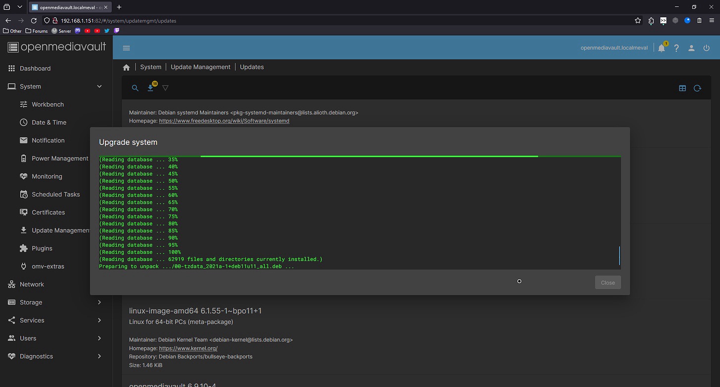 So, day 2. I go to open up my terminal when I remembered that my install of openmediavault had a web UI, which lets me do many things, including updating the machine.