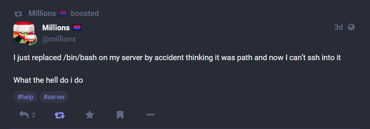 I didn’t know what to do, and I had to go somewhere soon, so I typed this up on my Mastodon account and left it for a bit.